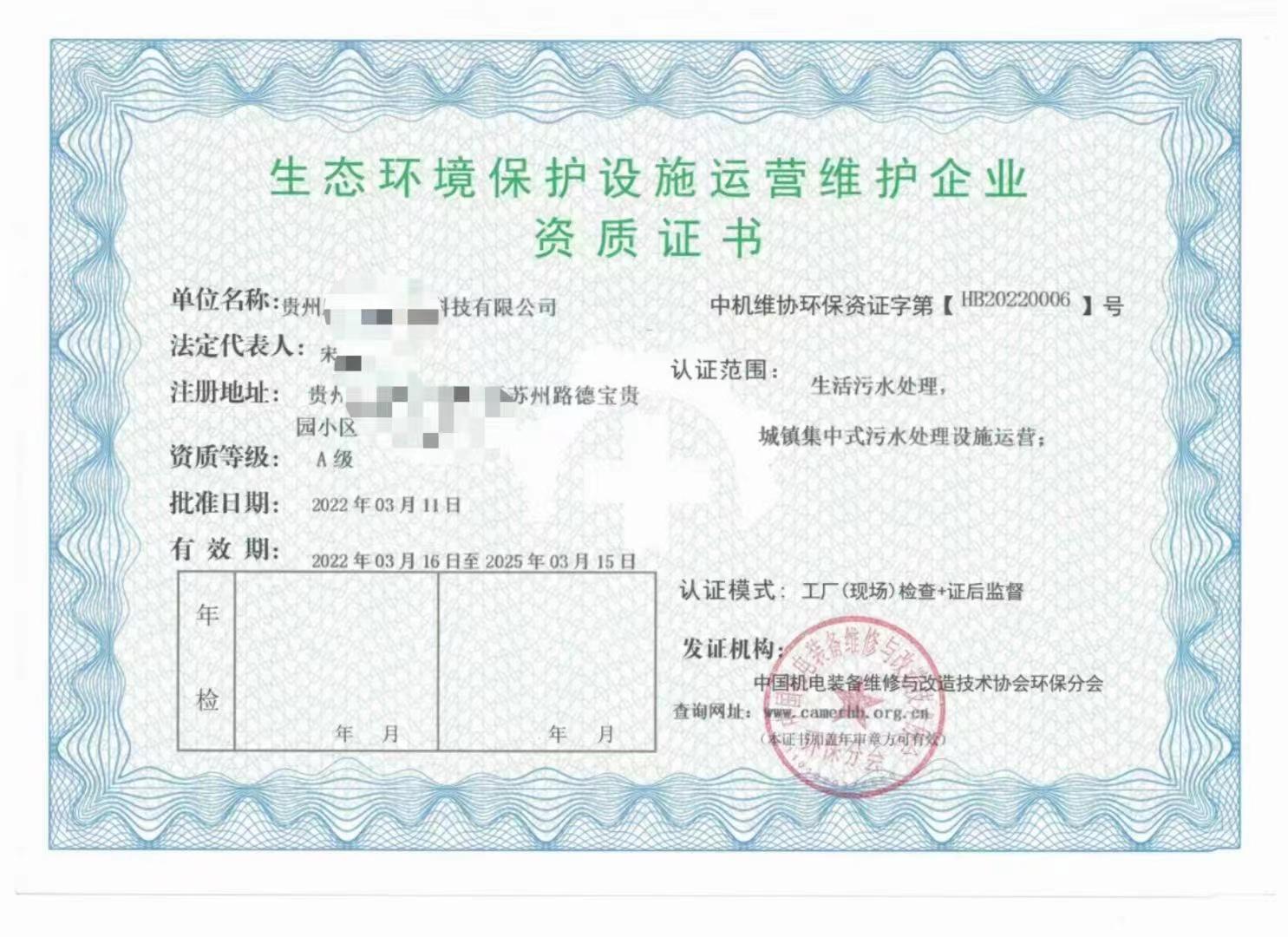 經過初審、現場審核、復審通過的企業,由中國機電裝備維修與改造技術協會環保分會統一頒發《生態環境保護設施運營維護企業》資質證書。