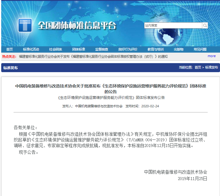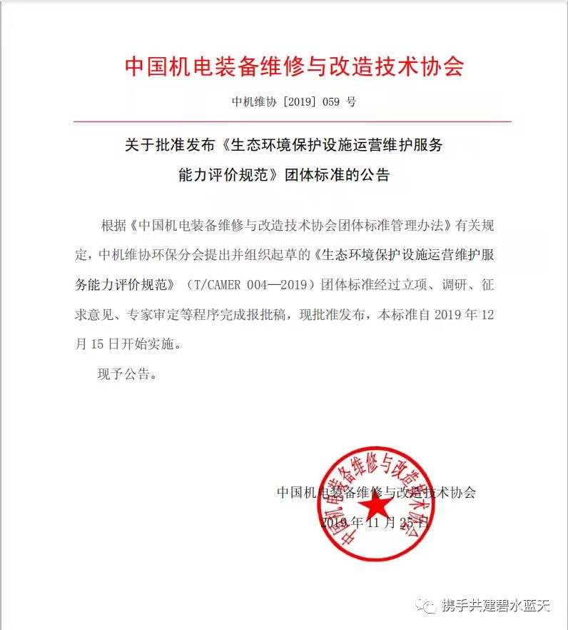 由鳳凰網(wǎng)報道,由中國機電裝備維修改造技術協(xié)會發(fā)起,聯(lián)合河北省環(huán)保治理運營行業(yè)協(xié)會、佛山市中環(huán)環(huán)保技術研究中心、中機國際工程設計研究院有限責任有限公司華東分院、廣東敏義環(huán)境科技有限公司、深圳市環(huán)境治理光電產(chǎn)業(yè)有限公司、佛山攸威光電科技有限公司、山東領先機械制造有限公司、山東濟寧精誠科技有限公司、山東棗莊遠程環(huán)保科技有限公司、石家莊科林威爾環(huán)保科技有限公司以及石家莊曼特水處理有限公司共同起草的《生態(tài)環(huán)境保護設施運營維護服務能力評價規(guī)范》團體標準,于2019年11月25日獲批發(fā)布,并于2019年12月15日正式實施。這是由協(xié)會牽頭制定的又一項關于生態(tài)環(huán)境行業(yè)方面的團體標準,不僅為提高生態(tài)環(huán)境保護設施運營維護企業(yè)的運營服務質量控制奠定良好的基礎,更為第三方治理行業(yè)的良性健康發(fā)展保駕護航。